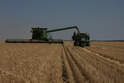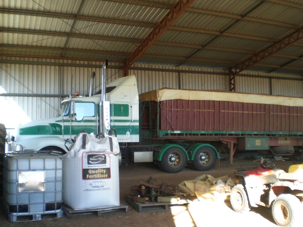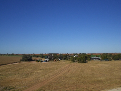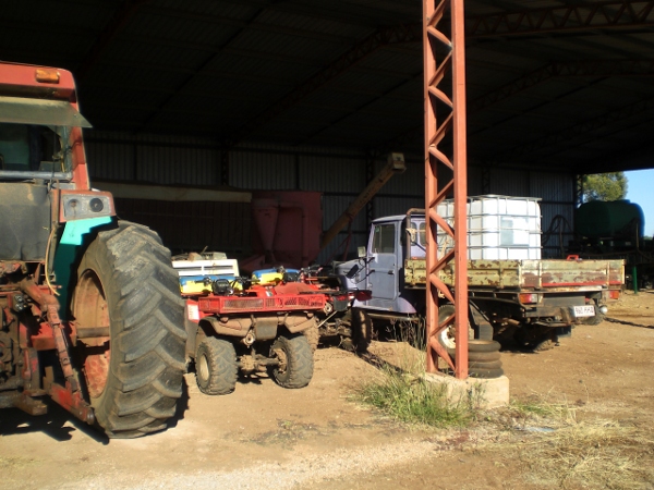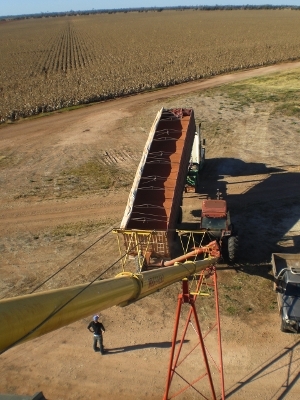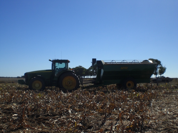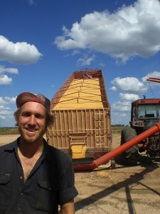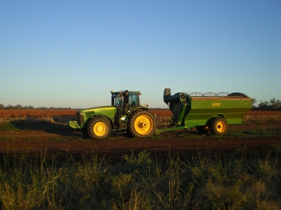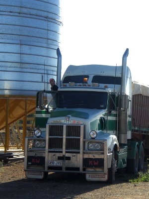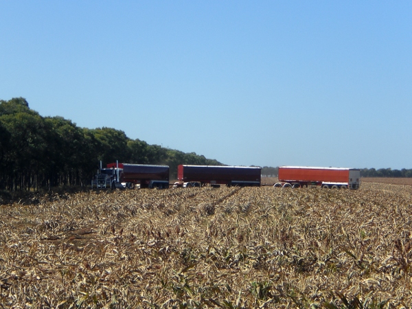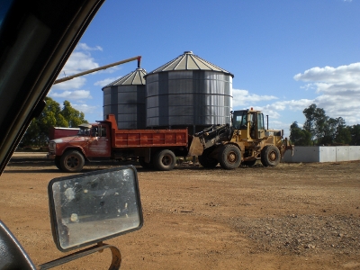 Nachdem ich einige Male mit Steve im Road-Train mitgefahren war und gesehen hatte, was die eigentliche Aufgabe während der Ernte für mich sein würde, konnte ich nach ca. drei Tagen, die wir bereits geerntet hatten, meinen eigenen Truck besteigen. Der Ablauf ist klar wie einfach: Mit dem Truck auf das gerade zu erntende Feld fahren, mit dem Truck unter die Spindelschnecke des sogenannten Field-Bin fahren und mittels der Spindelschnecke den Truck befüllen. Nach mehrmaligem hin- und hergelaufe zwischen dem Tracktor, der vor den Field-Bin gespannt ist und dem zu bewegenden Truck, damit sich die Hirse gut im Anhänger verteilt, gehts mit dem Truck zurück zum Silo, um dort zu entladen.