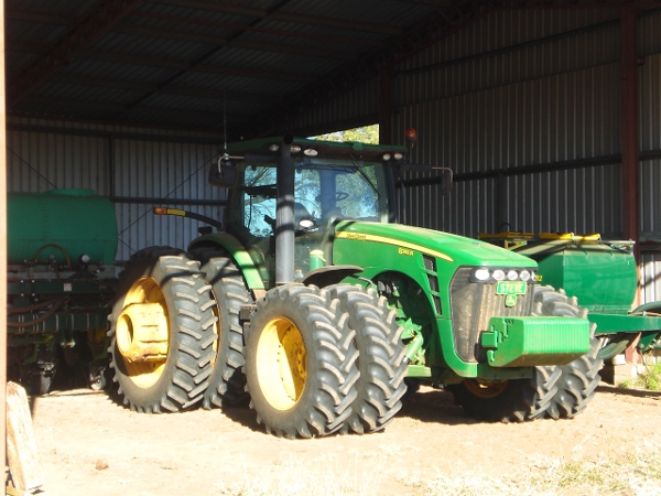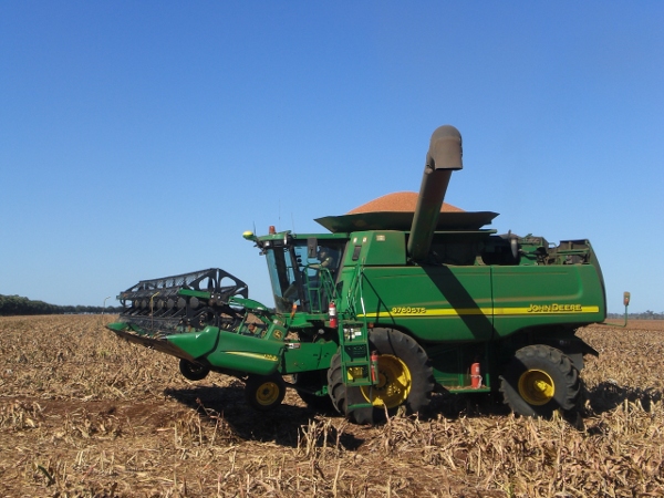 Also, Trecker-Fahren... ja, wo fängt man da an? Naja anfangs ist das erstmal neu. Da hat man so'n Trecker mit unglaublich viel Power und ganzen 16 Gängen. Das klingt erstmal wow, oder? Aber in echt braucht man die ersten 6 Gänge nie und fährt nie schneller als 20 km/h. Wären da nicht diese ganzen Schlaglöcher und Drainagehügel im Weg, aber natürlich ist der Trecker auch dafür gerüstet. Als Fahrer sitzt man nämlich auf einem in alle erdenklichen Richtungen gefederten Sitz (oder sollte ich Sessel schreiben?). Nachdem ich zu Beginn noch etwas in der Luft hing und den Boden mit den Füßen nur zwischen den Schlaglöchern mal kurz antippen konnte, hatte ich dann so nach etwa einer Woche endlich die richtigen Einstellungen gefunden und von da ab wieder häufiger Boden unter den Füßen. Und nun ging's los! Immer schön den Mähdrescher im Auge behalten, wenn dieser oben ein Hütchen bekommt schnell Trecker anwerfen und los geht's, ab zum Mähdrescher, Ladung übernehmen und zum Truck bringen oder zum Feldcontainer (Field-Bin). Dort Position einnehmen, schnell Tasten 1 bis 3 drücken, warten bis der Anhänger wieder leer ist (oder der Truck voll) umdrehen, Trecker ausschalten und wieder vorne anfangen. Und während das am Anfang ein Meisterwerk der Konzentration darstellte - oh nein zu nah dran, zu weit weg, welcher Knopf doch gleich? Ahh!!! ... der Truck ist voll... schnell ausschalten, welcher Knopf doch gleich? - war auch das schnell gelernt. Und wenn man sich über all diese Dinge keine Gedanken mehr machen muss, fängt man schnell an sich andere Sachen zu fragen, z.B. warum man bei 30° C im geschlossenen Trecker sitzt, ohne Klimaanlage weil der Motor ist ja aus - Benzinsparen! - mit langer Jeans und dicken Stiefeln, statt im Meer zu schwimmen. Dann macht man die Tür auf: Ahh, eine Briese, ist ja doch alles nicht so schlimm und dann kommt entweder ein Windzug und die Tür fällt zu oder der Mähdrescher fährt vorbei, sodass man vor lauter Staub die Tür freiwillig schließt und wieder ist die Sauna eröffnet. Besonders witzig ist das wenn man Kinder an Board hat die ununterbrochen fragen warum man die Klimaanlage nicht an macht und nicht fährt sondern immer nur rumsteht - schließlich sind die ja zum Treckerfahren und nicht zum im-Trecker-rumstehen-und-schwitzen mitgekommen.