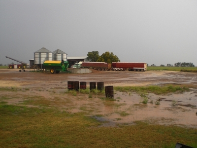 Vor vier Tagen haben wir nun ebenfalls die etwas stockende Maisernte abgeschlossen. Nachdem wir nämlich vor 3 Wochen damit begonnen hatten das einzige mit Mais bepflanzte Feld abzuernten, mussten wir nach etwa einem Viertel die Ernte vorerst abbrechen, da ein kleines Blitzkonzert des Nächtens über uns hinweggezogen ist. Gewitter in Australien! Dit war was, wa! Wie das gerummst, geleuchtet und gegossen hat...Zunächst die absolute Ruhe vor dem Sturm, ein paar Wetterleuchten und dann begann es langsam aber heftig zu Regnen... und heftig meint hier Bindfäden vom Himmel. Wir haben es uns auf der Veranda wie allabendlich nach Feierabend "gemütlich gemacht", um den Regenschauer und das heranrollende Gewitter auszusitzen. Doch der erwartete Regenschauer wurde etwas heftiger, sodass durch die "dichte" des Regens zunächst die Straße und dann auch die Silos vollkommen aus unserer Sicht verschwanden. Und so saßen wir da und es blitzte und rumste und polterte und dann noch mal RUMS und nach dem Blitz wars dunkel. Richtig Dunkel. Das war unser Strommast! Von nun an hatten wir nurnoch die Blitze als Lichtquelle.