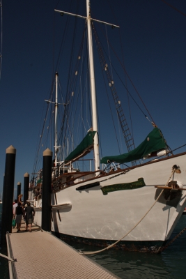 Gegen drei geht's los aufs Boot, uii...wie wir uns freuen. Unser Boot liegt erhaben in der Marina von Airlie Beach und gemeinsam mit unseren 14 neuen Nachbarn für die nächsten drei Tage und unserer Crew geht's an Bord. Ein paar einleitende Worte unserer Crew - Chay unser Käptain, Chris unser 1st Mate, Alan unser Chefkoch, Luke unser Tauchlehrer und Aileen unsere Hostess - und dann ging's ans beziehen der Unterkünfe. Nachdem alle sich etwas sortiert hatten fuhren wir dann mit Champagner in der Hand und Häppchen a lá Alan auf dem Tisch den Whitsundays entgegen. Später gab's noch eine Einführung für alle Tauchwilligen zu denen wir natürlich auch zählten und nach einem hervorragenden Drei-Gänge-Abendessen saßen wir dann mit den letzten Wachen bei Bier, Wein und Gitarrenmusik vom Käptain auf Deck.