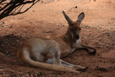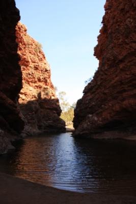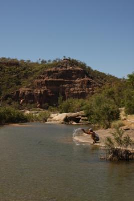 Wasser! Wir haben Wasser gefunden... zwar reicht es grad zum plantschen und ist von dem reißenden Fluss auf den Bildern in der Touristeninformation meilenweit entfernt, aber immerhin ist der Fluss nicht ganz trocken. Es hat hier seit über einem Jahr nicht geregnet. Das muss man sich mal vorstellen, etwa 300km weiter östlich hatte man letztes Jahr Cyclone und schwere Überschwemmungen und hier gab's nicht mal Regen. Und während die Infobroschüre von einer Oase im Outback schwärmt, denken wir uns: Shit, wir hätten später losfahren sollen... es ist erst 15.00 Uhr, im nicht vorhandenen Schatten sind es um die 40°C und es sind noch mindestens 3-4 Std. bis die Sonne untergeht. Das Wasser auf dem Bild ist nämlich nur durch den Abstieg in die Schlucht zu erreichen (unser Camp und wir sind dort oben, etwa auf Höhe der Kuppe), was bei der Hitze einfach unbewältigbar scheint. Um aber das Wasser doch noch mit eigenen Augen zu sehen, stehen wir am nächsten Morgen extra früh auf und beginnen den Abstieg um 8.00 Uhr und als wir etwa um 10.00 Uhr völlig verschwitzt wieder am Auto sind, sind wir froh keine Minute später losgegangen zu sein!