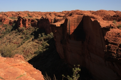 Morgens halb 6 in Australien: Den Aufstieg, und damit den schwierigsten Teil, haben wir schon hinter uns. Nun folgen etwa 6km immer mehr oder weniger am Rande der Kings Canyon-Schlucht.